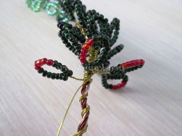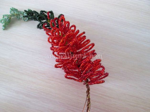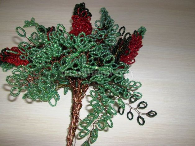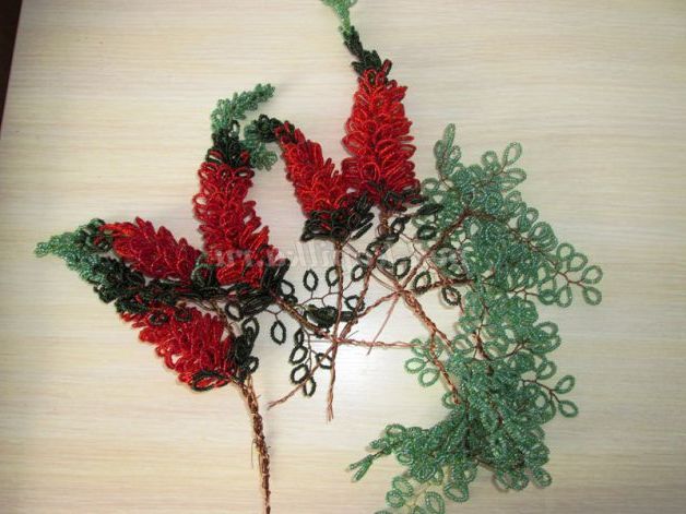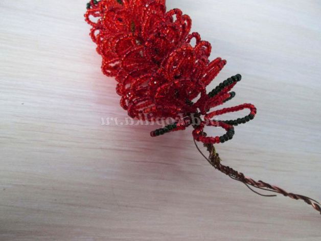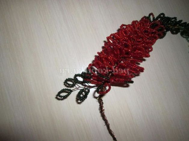 Приблизно з 20 - бісерного листочка, набираючи тільки червоний бісер різного відтінку, змішуючи його відтінки, плетемо суцвіття до кінця.