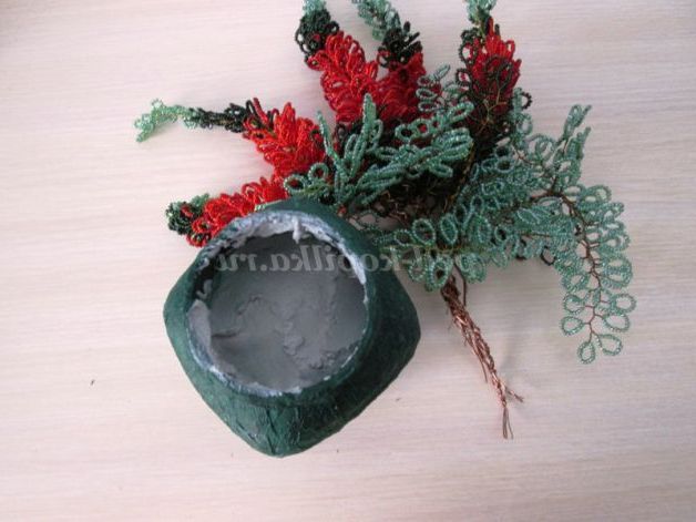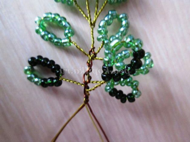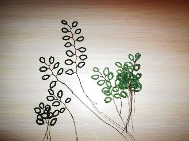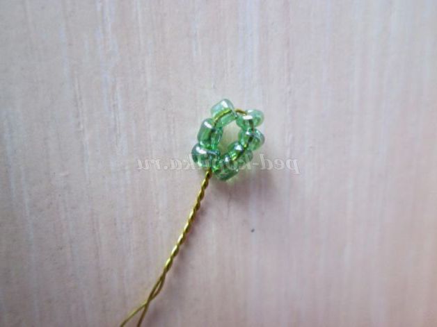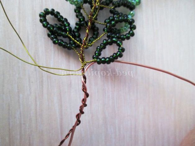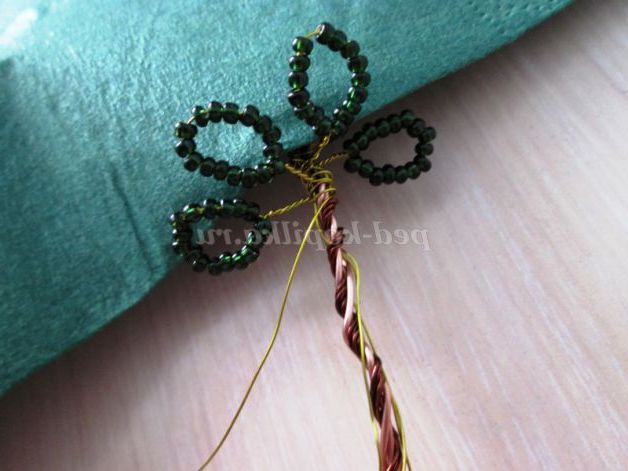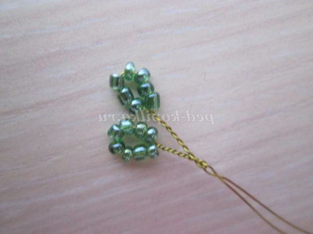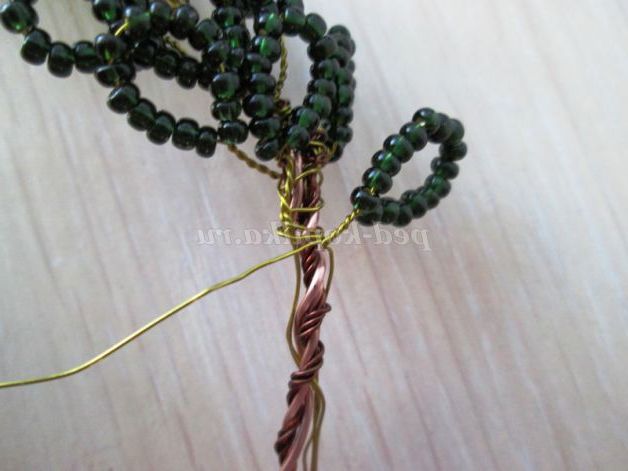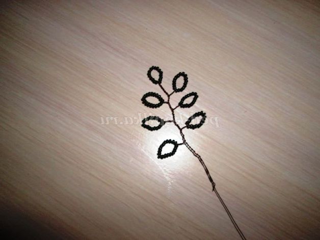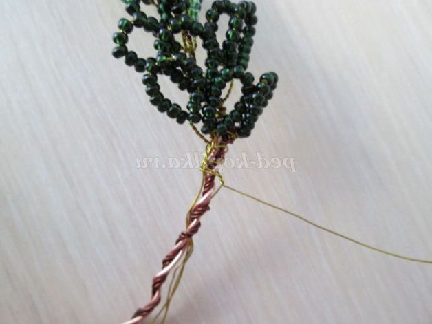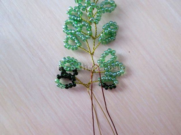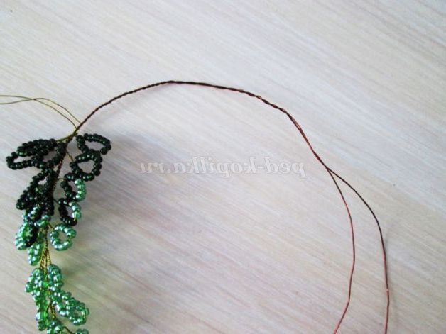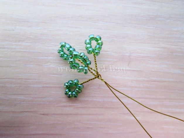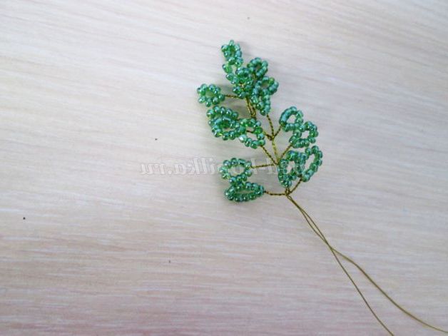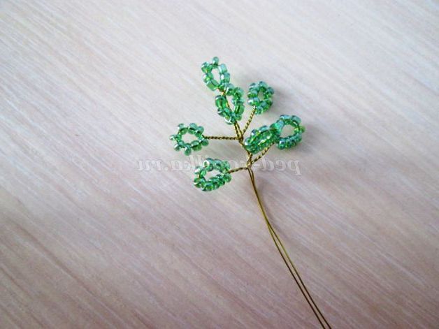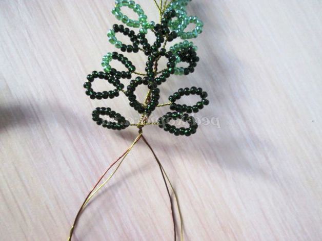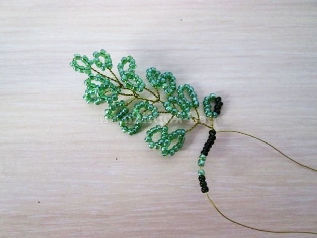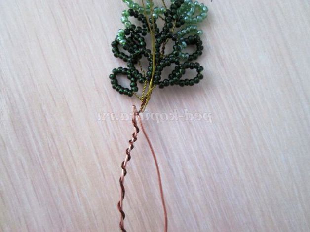 Плетемо суцвіття до ряду з 15 темно-зеленими бісеринками в листочку, це приблизно 8 див. суцвіття і зміцнюємо стебло дротом товщиною 1 мм., довжиною 40 див., закріплюючи її наступним чином. Половину товстої дроту щільно скручуємо з попередньо скрученої дротом 0,5 мм.
