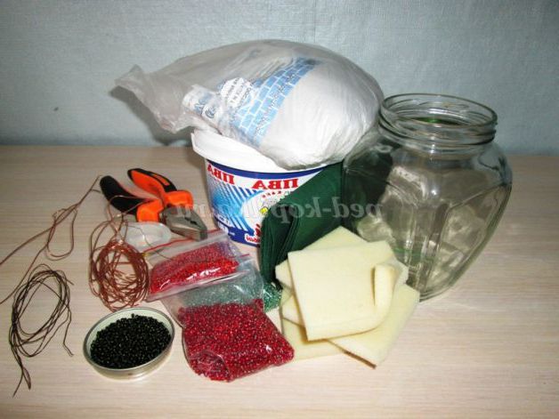 Для виконання роботи нам знадобляться наступні матеріали та інструменти: бісер потрібних кольорів, дріт 0, 3 мм, 0,5мм., 1мм., пасатижі, банку-ваза для букету, серветки, клей ПВА, будівельний гіпс, шматочок поролону.