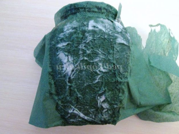 Прикладаємо паперову серветку, попередньо злегка її зім'явши. Поверхня серветки знову промазуємо клеєм, робимо це акуратно, щоб не пошкодити поверхню.