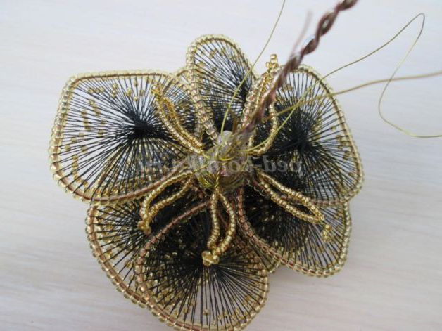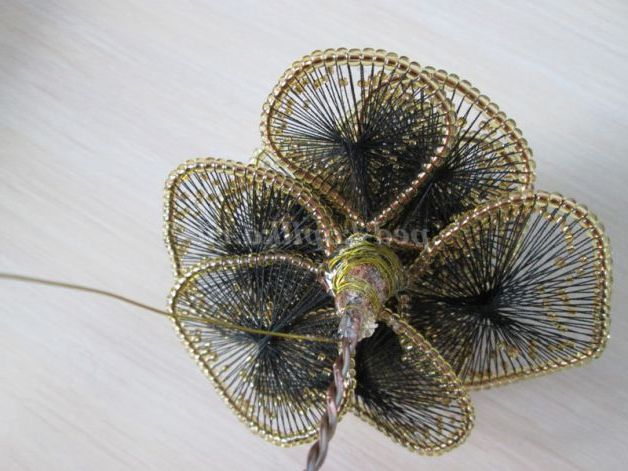 Для листочків наберемо бісер на дріт 0,8 мм. по 56 штук для кожного. Обмотаємо пелюстки спочатку чорної, а потім золотою ниткою.