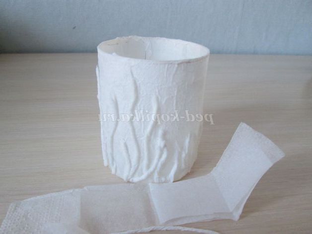Тепер приступимо до виготовлення квіткового горщика. Обклеїмо баночку білою серветкою з допомогою ПВА.