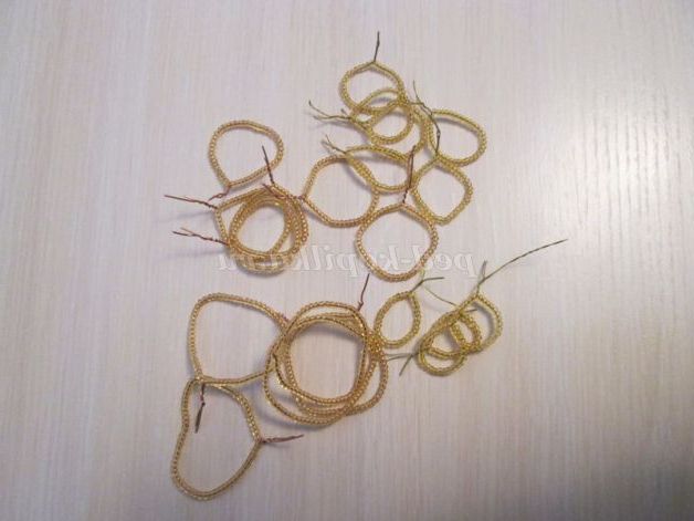 Потім на таку ж дріт будемо набирати по 50 бісеринок для пелюсток середньої частини троянди. Таких пелюсток буде 6. Далі візьмемо дріт 0,4 мм. і зробимо 6 пелюсток по 40 бісеринок і 4 пелюстки по 30.
