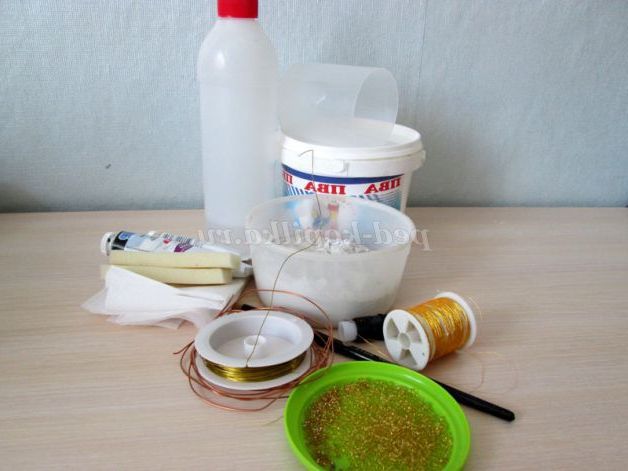 золотистий бісер двох видів, чорні швейні нитки, золота металізована нитка, клей ПВА, клей ТИТАН, дріт різного перерізу, паперові серветки, гіпс, пластикова баночка, акрилова фарба, шматочок поролону, ножиці, пензлик.
