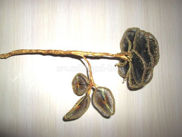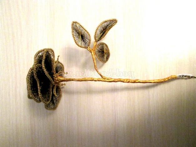 Тепер приступимо до складання троянди. Спочатку для стебла візьмемо 40 див. дроту завтовшки 1мм., складемо її в 2 рази і скрутимо. Так само візьмемо один з самих маленьких пелюсток.