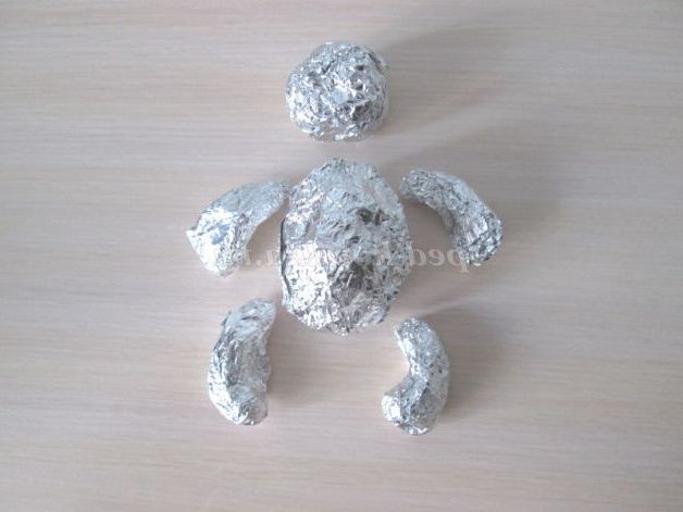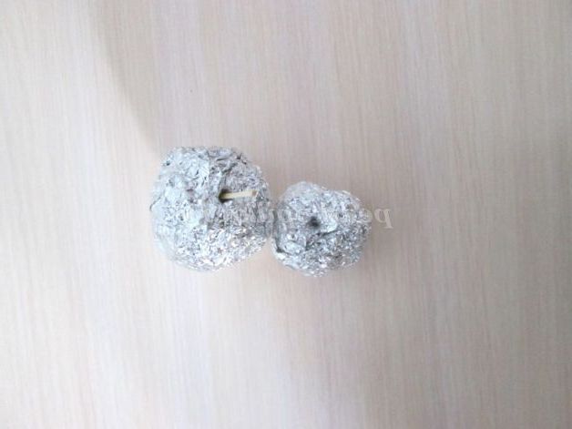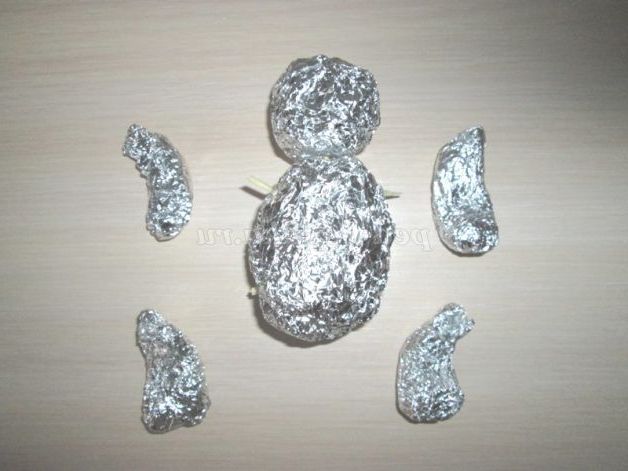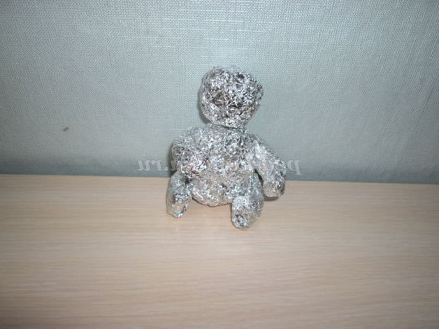 Почнемо роботу з виготовлення каркаса ведмедя з фольги. Звертаємо досить щільно дві кульки різної величини для тулуба і голови і чотири овалу для лапок, яким надаємо необхідну форму.