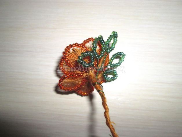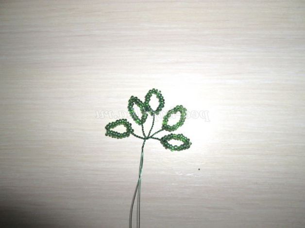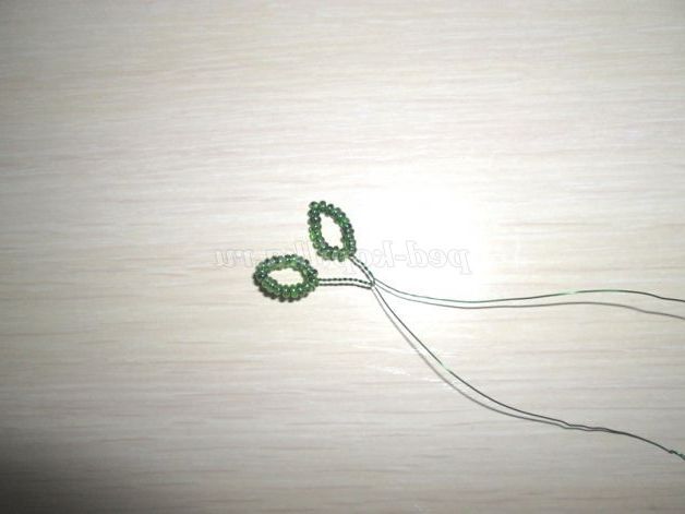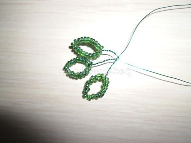 Зробимо зелені листочки. Для цього на дріт наберемо 20 зелених бісеринок і закрутимо дріт, формуючи листочок.