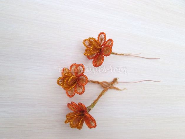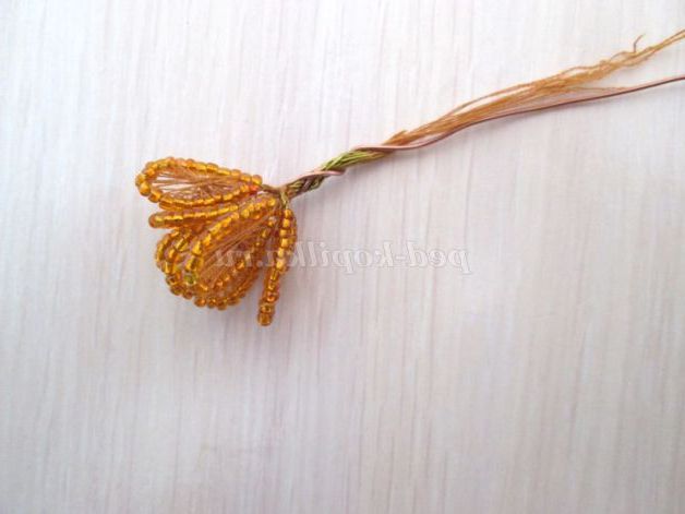 Приступимо до виготовлення весняних квітів. Мені хотілося, щоб вони нагадували купальницю (вогники). На дріт набираємо по 30 бісеринок помаранчевого кольору для зовнішніх пелюсток і скручуючи дріт формуємо пелюстка, для однієї квітки робимо 7 пелюсток.