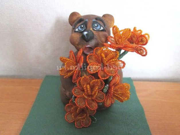 Всього для букета я зробила 7 квіток зі стеблинками різної довжини, щоб можна було формувати букети різної форми. Та й закріплювати в лапах ведмедя їх можна по різному. На наступних фотографіях це можна побачити.