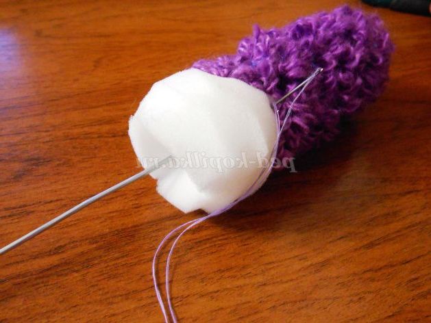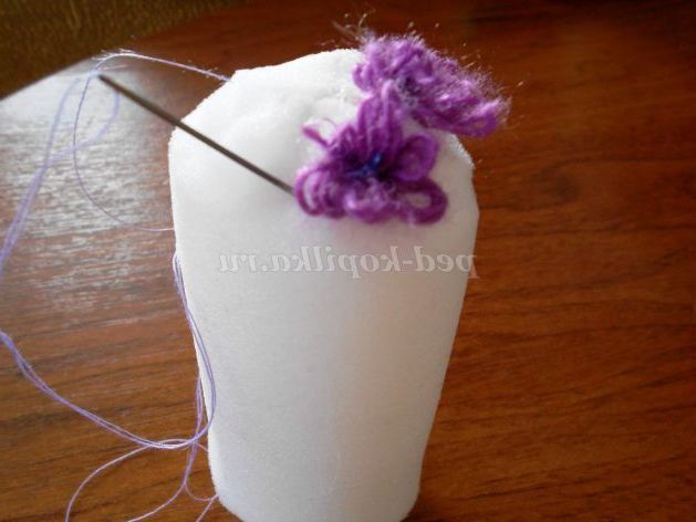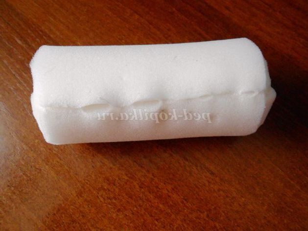 19. Далі беремо заготовку поролону і починаємо пришивати заготовлені квіточки, поглиблюючи їх в поролон. Тобто, пришивши одна квітка, виводимо голку з ниткою з протилежного боку валика, одночасно стягуючи нитка, що з'єднує два протилежних квітки. Така швейна операція нагадує техніку торцювання. Подібно двом пришитим квіткам, обшивають весь валик, але не доходимо до нижнього краю десь 3-5 см