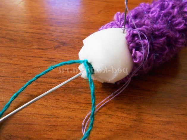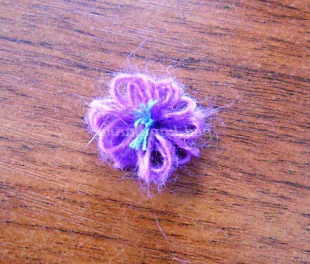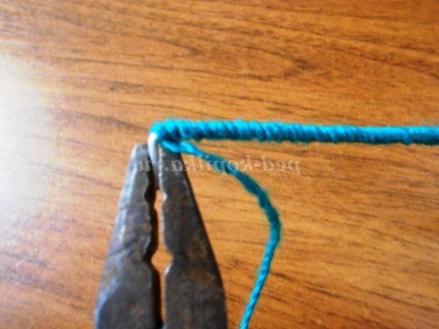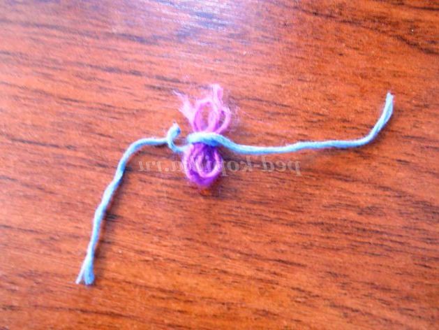 23. Нижній кінець «стебла», 1 см, зігнемо під прямим кутом за допомогою плоскогубців. З пряжі зробимо петельку і завяжем вузлик