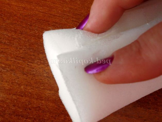 1. Для виготовлення гіацинтів, нам потрібно зробити основу для самого квітки. Для цього виріжемо з шматка поролону прямокутник з розмірами сторін, приблизно, 13, 16 см