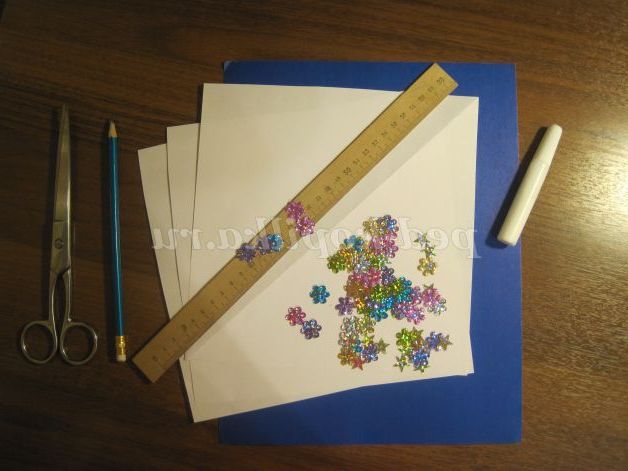 Буде потрібно: три квадрата білого паперу зі стороною 21 см, ножиці, клей, олівець, лінійка, нитки муліне, декоративні прикраси.
