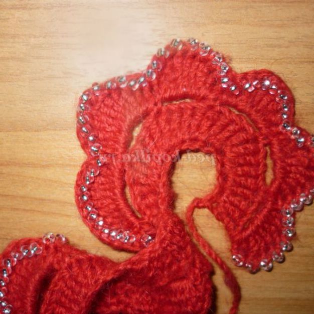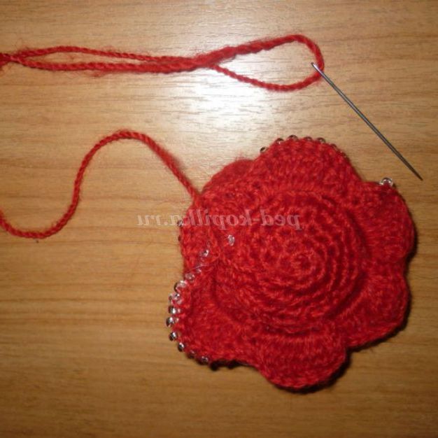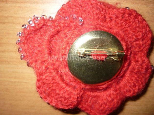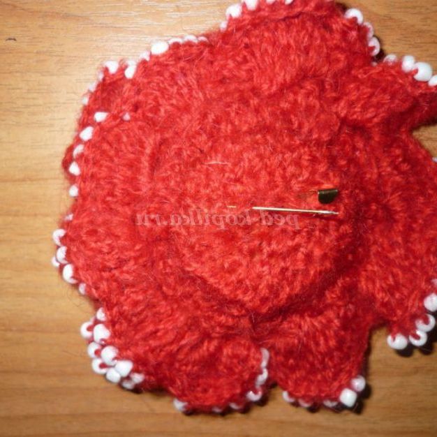 Таку брошку можна пов'язати і з тонких ниток (наприклад, «Ірис»),доповнивши нею річний наряд! Нанизати бісер на нитку в тому випадку, якщо ви не знайшли відповідну голку (в яку пройде бісер) або працюєте з тонкою ниткою можна наступним способом: просмикнути швейну нитку в голку для бісеру і зав'язати, щоб утворилася петелька. У цю петлю ми як у вушко голки вденем пряжу. Нанизуючи бісер на голку, протягуйте його спочатку на швейну нитку, а потім на пряжу.