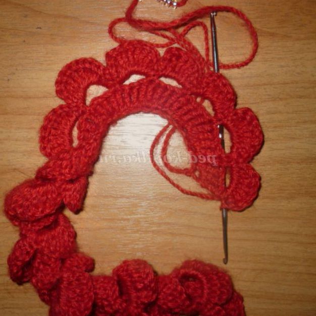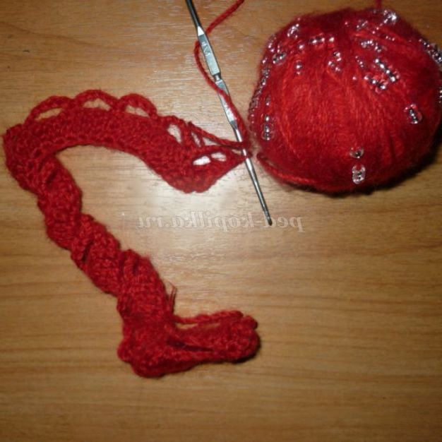 1 звичайний стовпчик, 1 стовпчик з накидом, 7 стовпчиків з двома накидами, 1столбик з накидом, 1 звичайний стовпчик. Так в'язати до початку арочок з чотирьох повітряних петель.