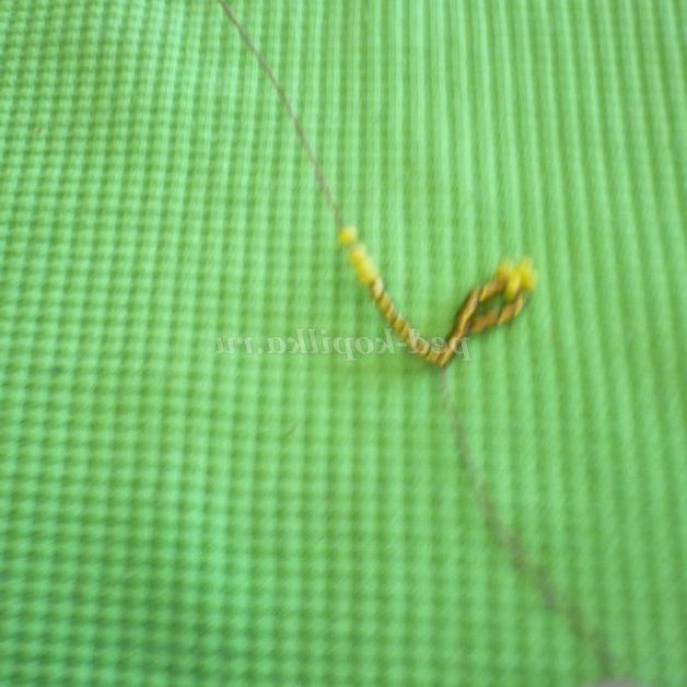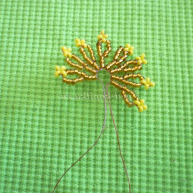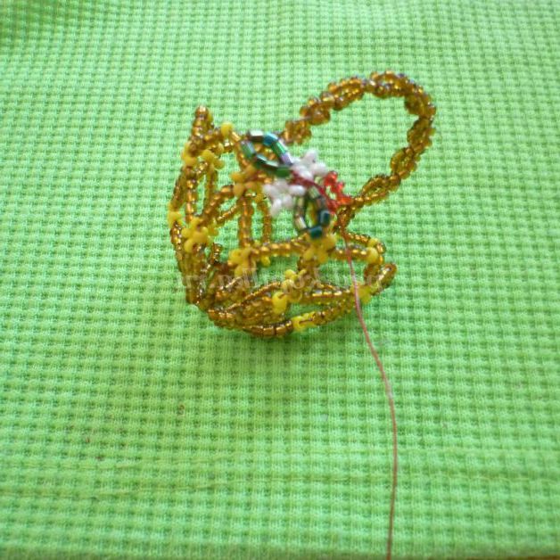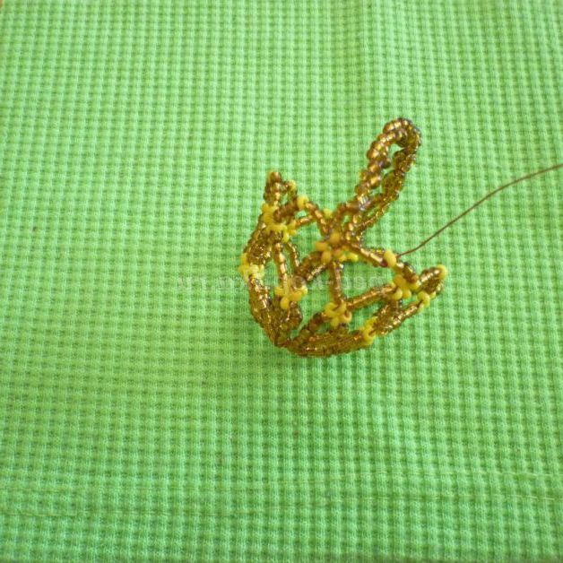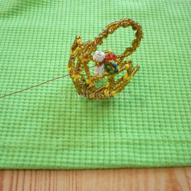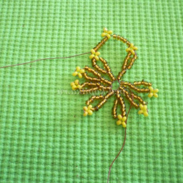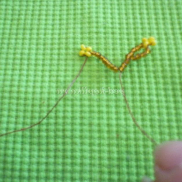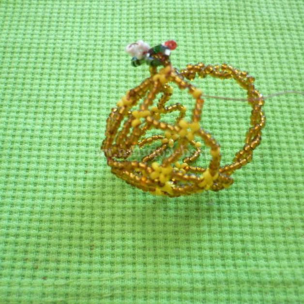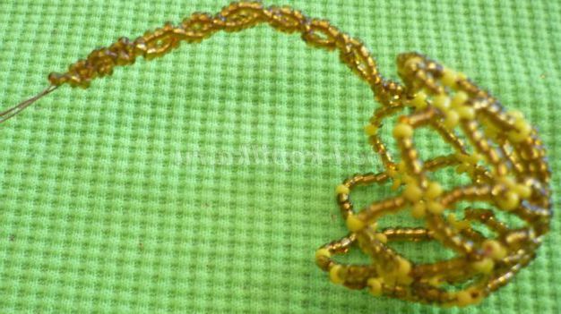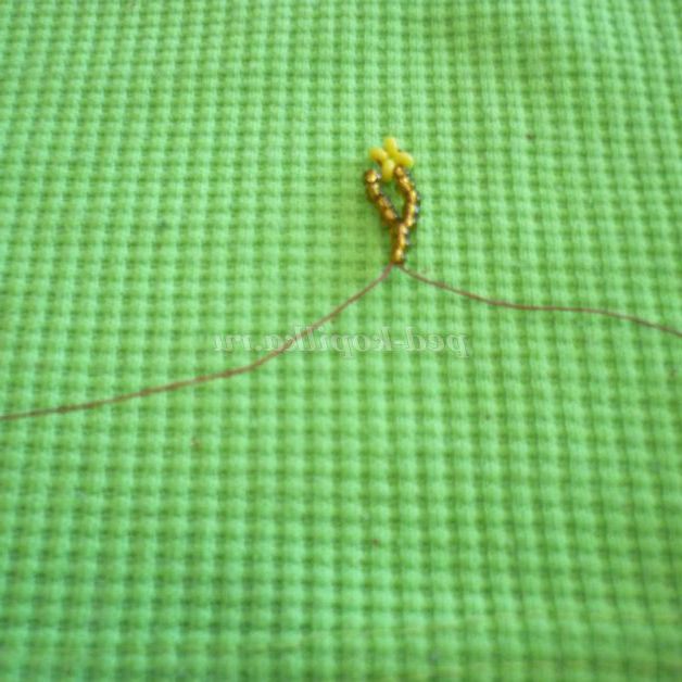 7.Начинаем плести другий ряд кошики. Одягніть 5 бісерін золотистого кольору і 4 жовтого. Пройдіть в першу бісерину з 4-х.подтяните дріт.