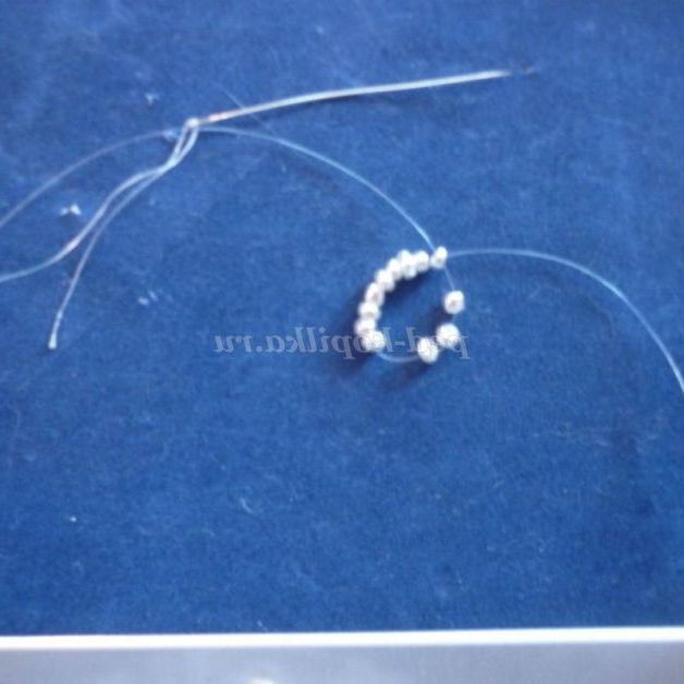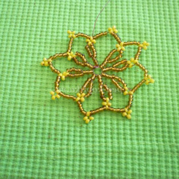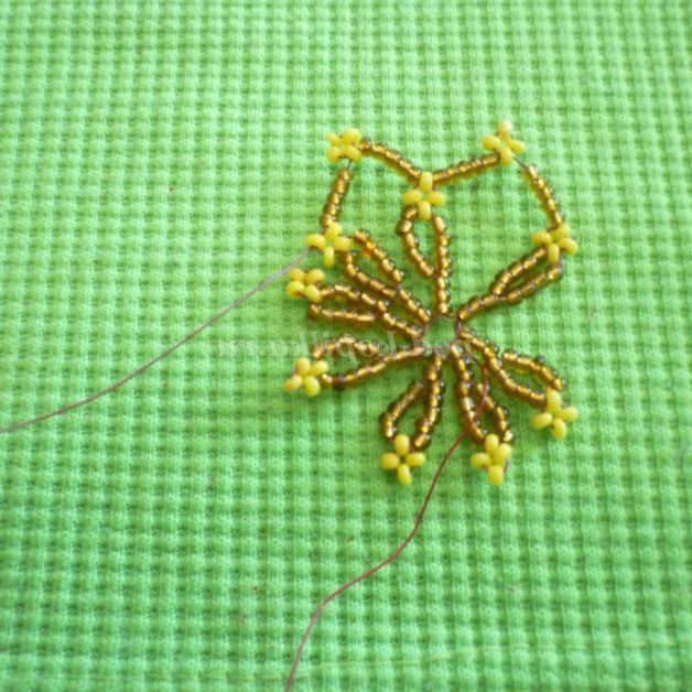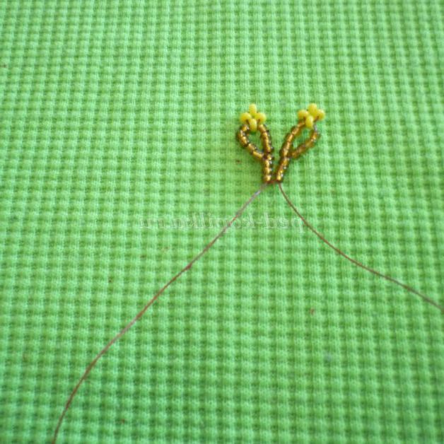 2.Наберите ще п'ять золотистих бісерін і проведіть дріт через 3 золотистих бісеріни третю, другу і першу. Підтягніть дріт.
