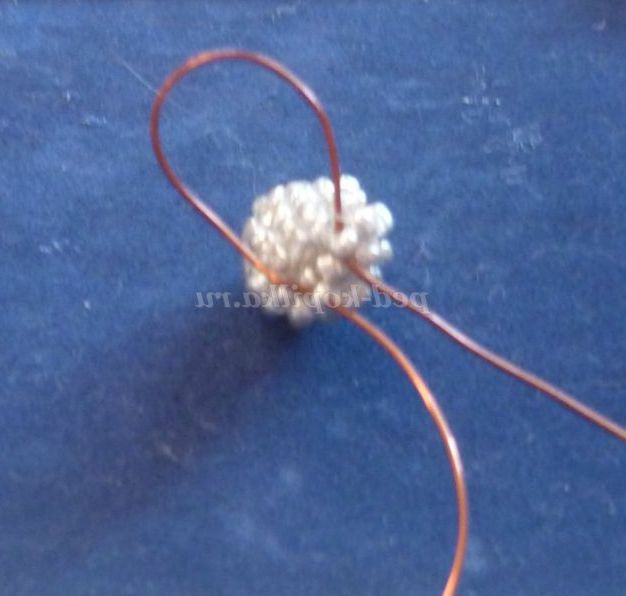 9.Отрежьте шматочок дроту довжиною 20-30 див Пройдіть дві бісеринки підстави нирки. Скрутіть дріт.
