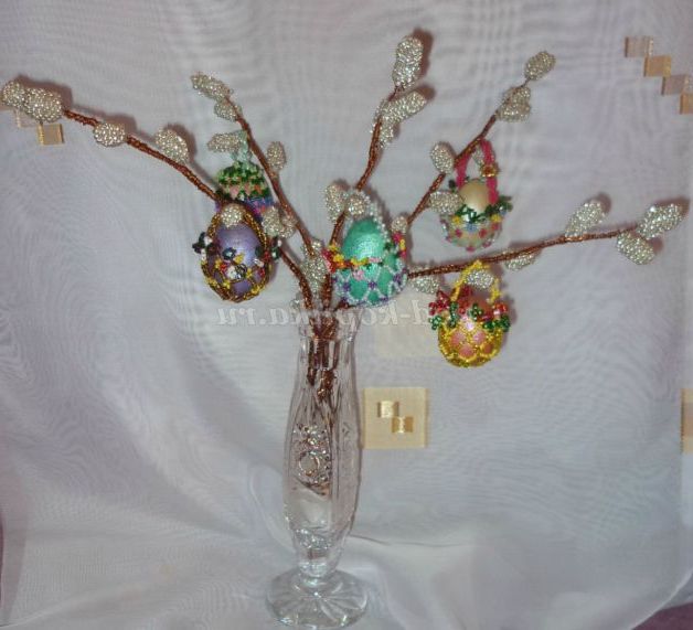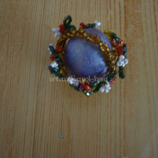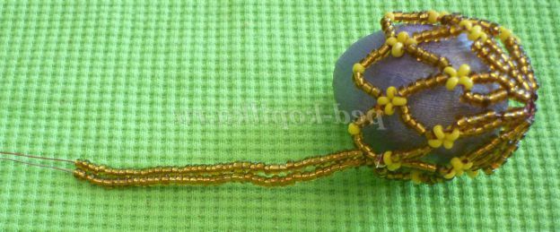 19.Яйцо в кошичку можна використовувати як для великоднього букета, так і як окремий сувенір. Для того, щоб додати стійкість кошичку сплетіть підставку у вигляді кільця з 15 великих бісеринок.