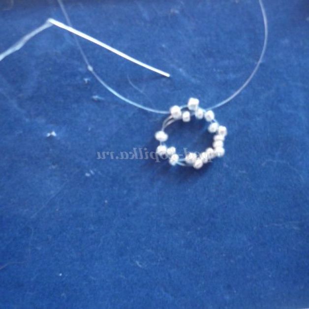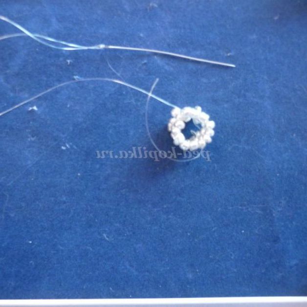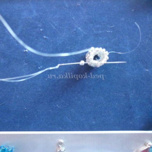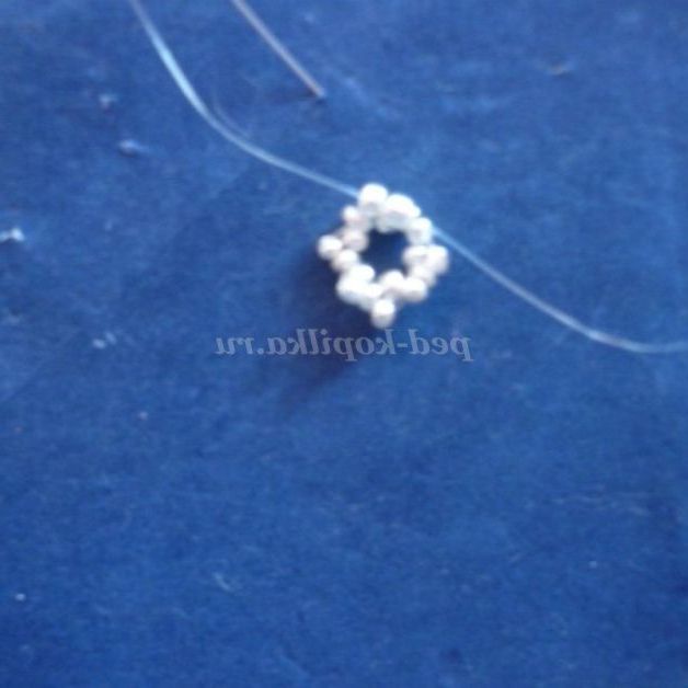 1.Вставьте волосінь в голку. Наберіть 12 бісеринок і пройдіть в першу «в прямому напрямку», щоб вийшло кільце.