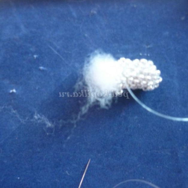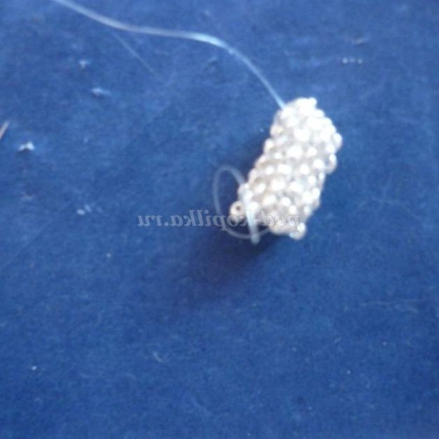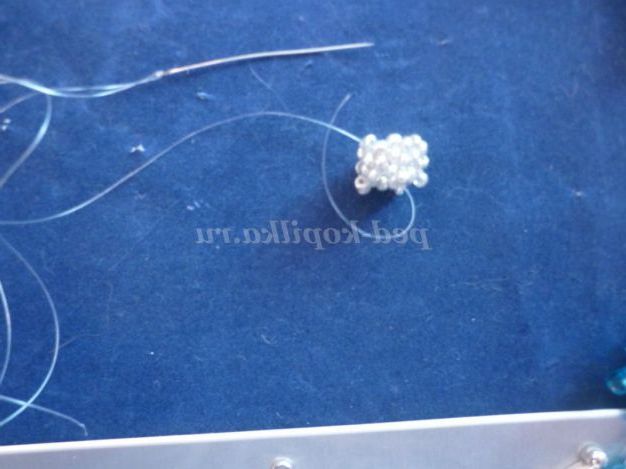 попереднього ряду, при цьому одну ви пропускаєте. Пройдіть так весь ряд. Стягніть волосінь і через бісеринки виведіть волосінь до основи.