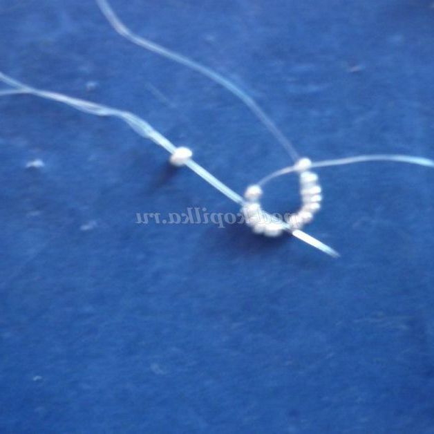 2.Наденьте одну бісеринку і пройдіть голкою в бісеринку першого ряду, пропустивши при цьому одну бісеринку.