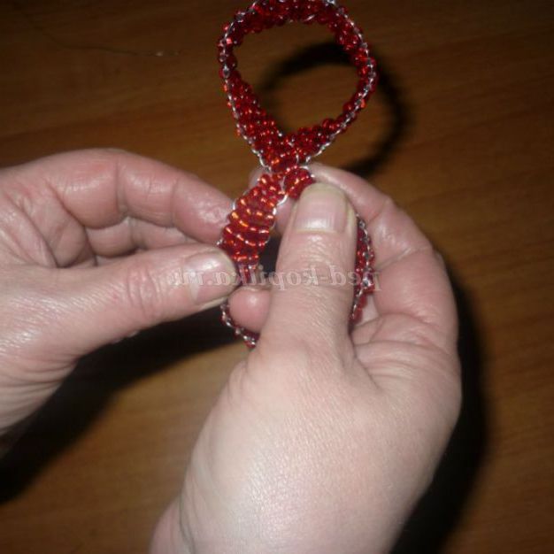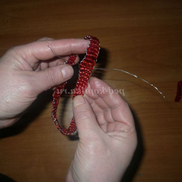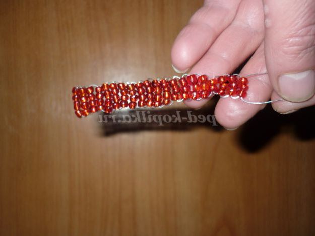 10.Продолжаем плетіння смужки в дзеркальному відображенні: три ряди по три бісеринки в кожному, один ряд-дві бісеринки, знову три ряди по три бісеринки, і завершуємо плетіння дванадцятьма рядами по чотири бісеринки в кожному (так само як і починали)