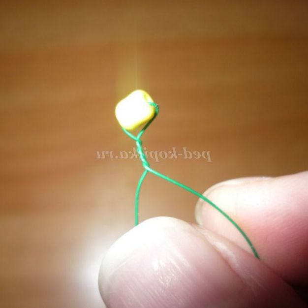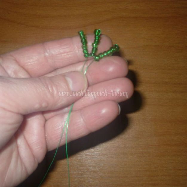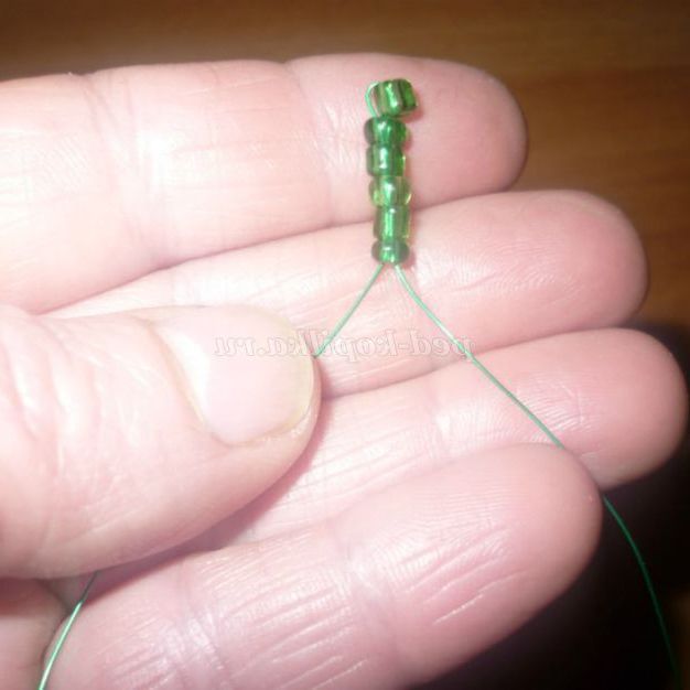 1.Отрезать шматочок дроту довжиною 60см.(бажано зеленого кольору. Одягнути шість бісеринок, пройти через п'ять у зворотному напрямку,