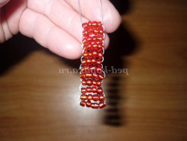 5.Теперь найскладніша частина роботи: потрібно продовжити плетіння 28 рядами по чотири бісеринки в кожному.