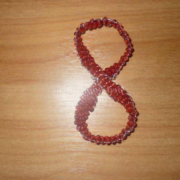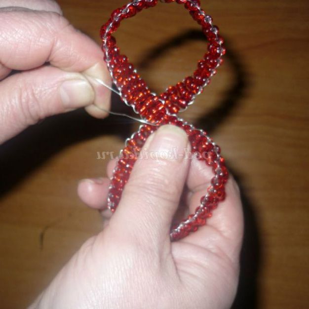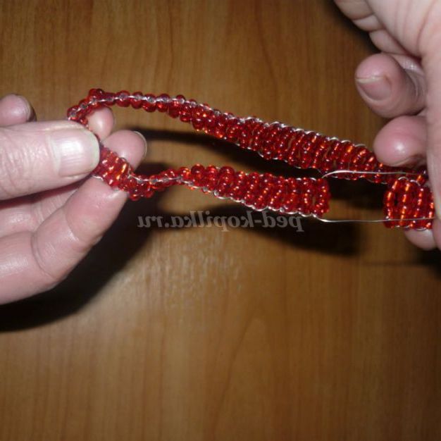 1.Отрезать дріт довжиною 1м.20см. Набрати 8 бісеринок червоного кольору, вирівняти кінці дроту, щоб бісеринки опинилися на її серединці.