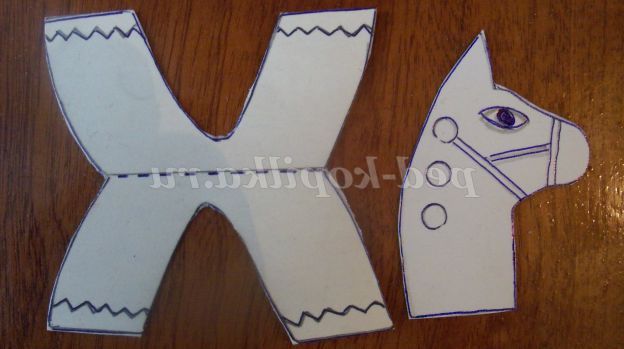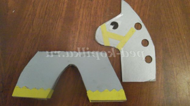 5. Викройте і виріжте з сірого двостороннього картону за шаблоном голову, ноги конячки, якщо у вас односторонній картон тоді переведіть шаблони ще раз в дзеркальному відображенні, і склейте між собою