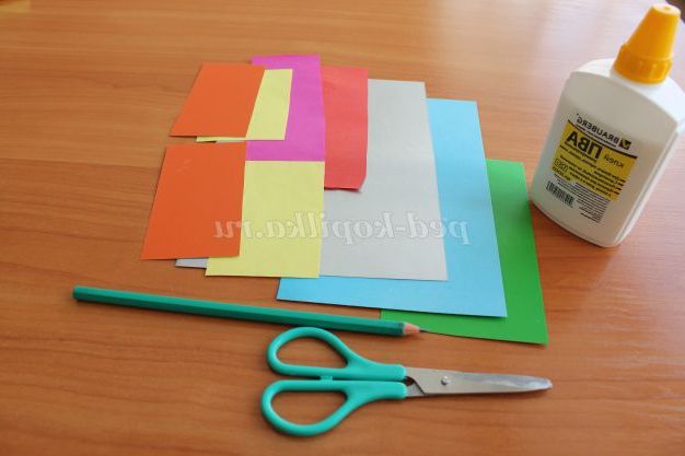 Набір кольорового паперу, Клей ПВА, ножиці, олівець. Аркуш картону складений навпіл.