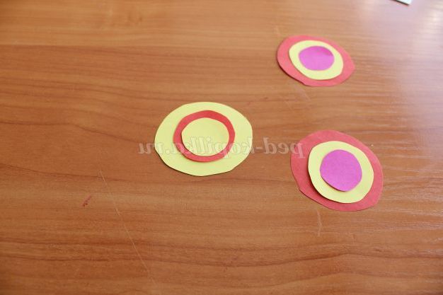 Далі готові різнокольорові гуртки наклеює на підставу стебла і вставляє в кишеню листівки. Робота готова.