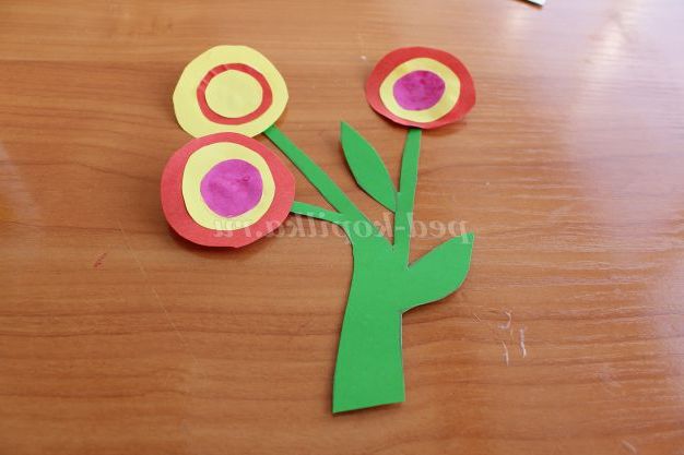 Завдання: вчити дітей малювати самостійно форму кола на кольоровому папері. Вирізати з прорисованному контуру, складати композицію з квітів, виховувати впевненість у своїх здібностях. Розвивати вміння самостійно виконувати роботу від початку до кінця. Зміцнювати і розвивати дрібну моторику.