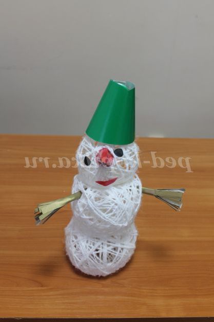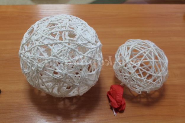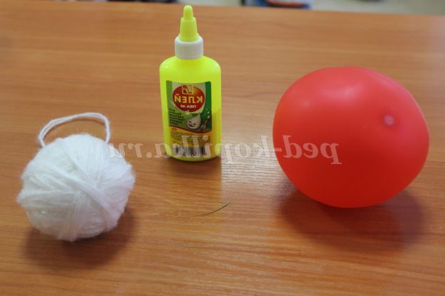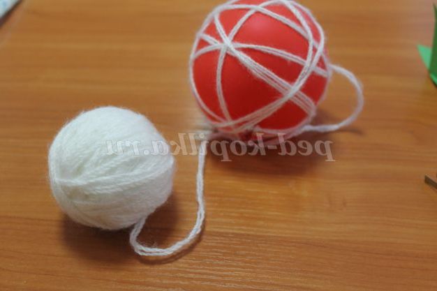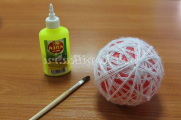 Переходимо до створення Сніговика. Для нього надуваємо невеликий кулька, намотуємо на нього нитки білого кольору, бажано не занадто тонкі, потім обмазуємо його повністю клеєм ПВА, і даємо добре висохнути.