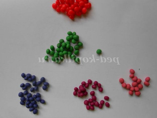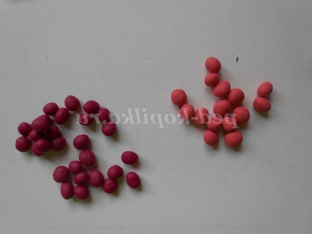2. Свою роботу починаємо з головного героя. Для цього нам потрібно написати дуже багато кульок світлого і темно-рожевого кольору. Кульки повинні бути дуже маленькі, тому відщипуємо пластиліну зовсім небагато. Круговими рухами великого і вказівного пальців скачуємо кульку.