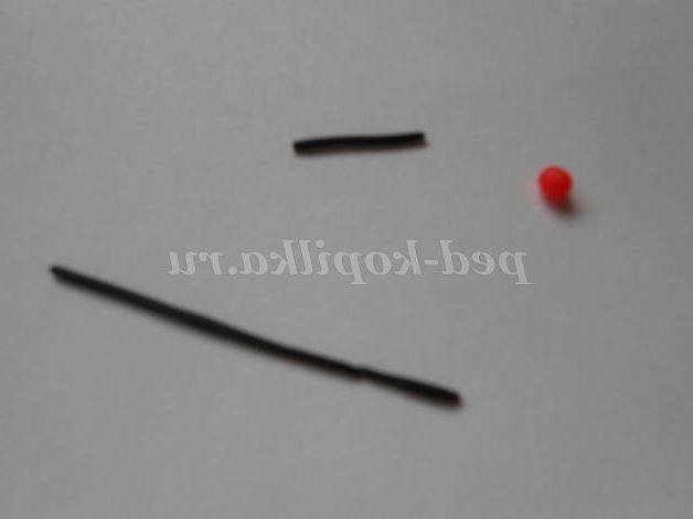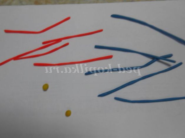 4. Після цього потрібно зробити дрібні деталі. Брови і рот робимо з тонко розкатаних джгутиків чорного кольору, язичок з червоної кульки, очі з кульок чорного кольору.