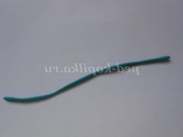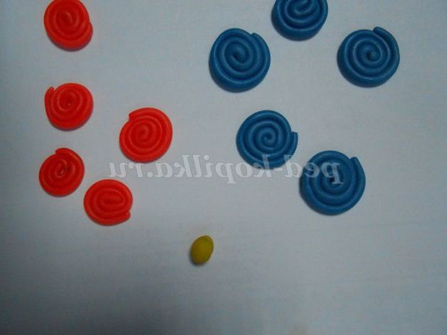 8. Квіточки на галявині робимо іншим способом. Відщипуємо невеликий шматочок, розкачуємо його в довгий джгут, а потім скручуємо по спіралі. Так робимо по п'ять спіральок кожного кольору.
