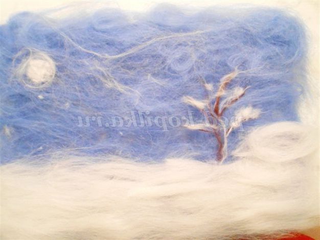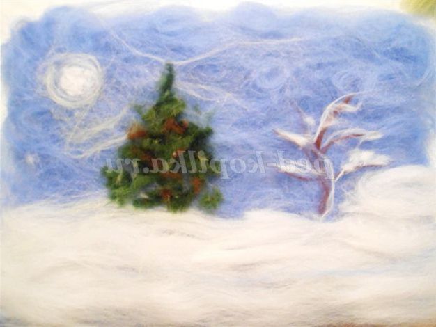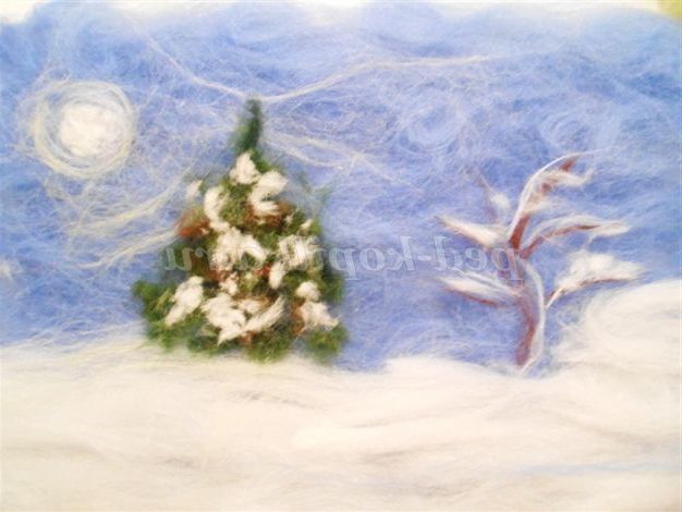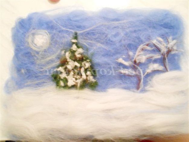 7. Коричневої і білої шерстю малюємо стовбури дерев. Для цього витягуємо тонкі довгі пасма і злегка скручуємо їх. Таким же чином малюємо гілочки. Шляхом «настригания» білої вовни малюємо на гілках сніг.