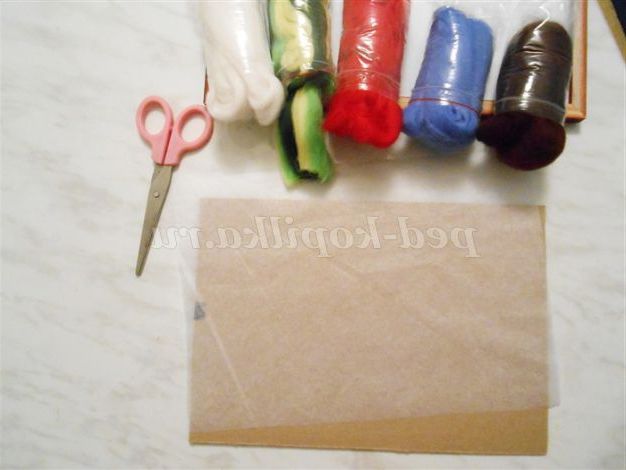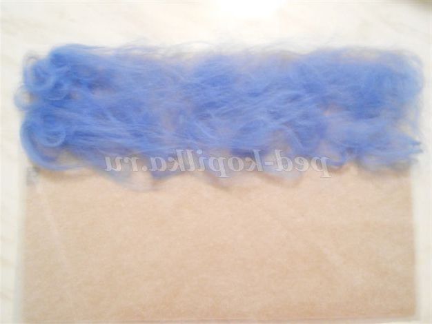 2. Приступаємо до формування заднього плану картини. При цьому використовуємо метод роботи з вовною - "щипання". Метод "щипка": беремо в одну руку гребінну стрічку потрібного нам кольору, при цьому береться саме згин стрічки, пальцями іншої руки ми частими швидкими рухами щипаємо поверхневі волоски стрічки. В руках утворюється пухнастий клубочок, який ми і викладаємо на робочу поверхню.