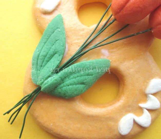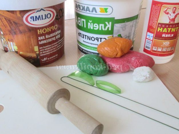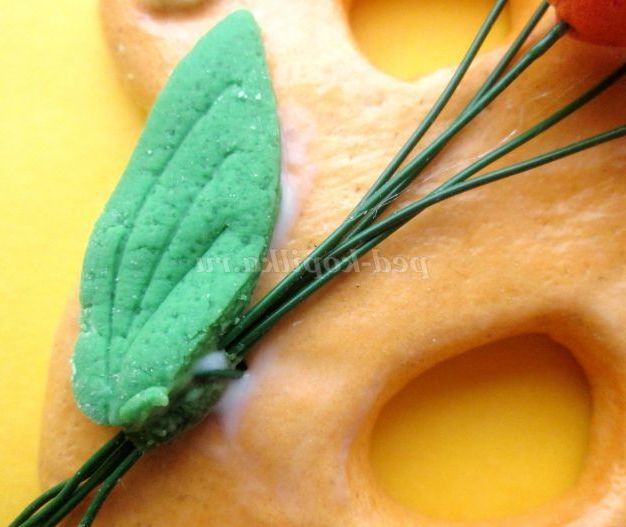 Матеріали: 4 кольори солоного тіста - зелений, білий, жовтий, червоний; клей ПВА; кисть; зубочистка; формочка-листок велика і маленька; лопаточка (можна користуватися і стеком); скалка; дошка для розкачування тіста; шматочок тонкого дроту; канцелярський ніж, лак.