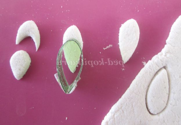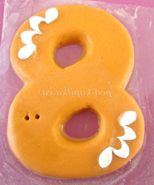 Зробимо прикраса вісімки. Малої формочкою-листком з білого тіста вирізаємо 4 деталі прикраси вісімки, як показано на фотографії.