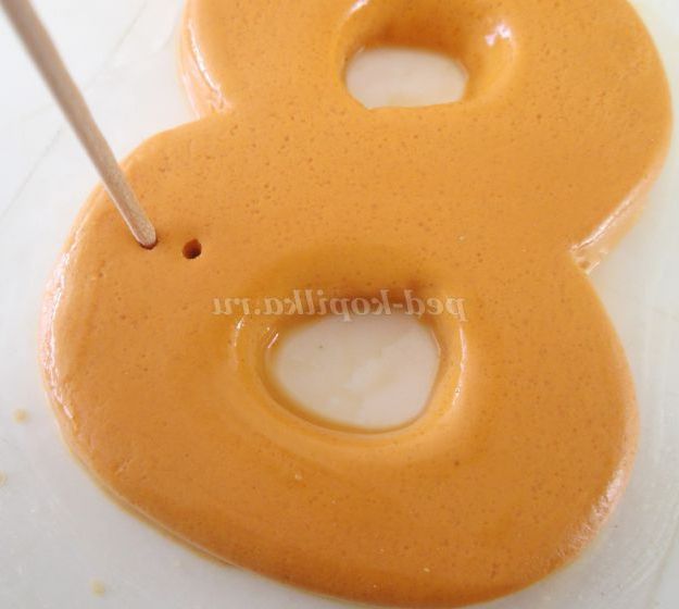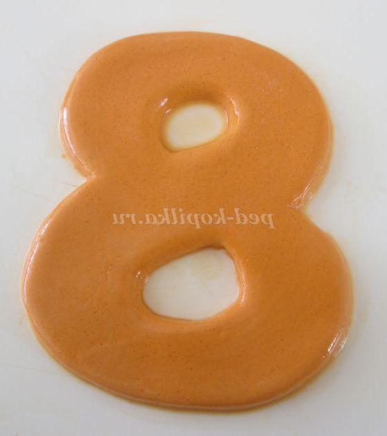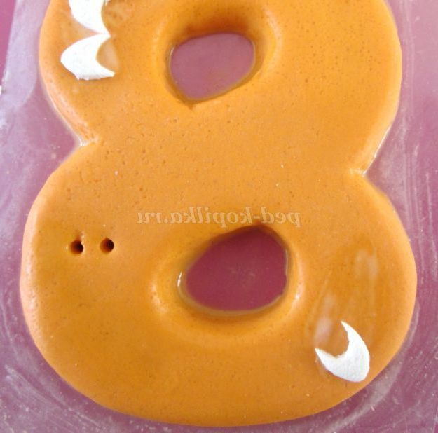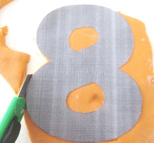 Розкачати тісто жовтого кольору, товщиною 0,7-1 см Вирізати з нього канцелярським ножем вісімку.