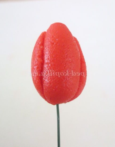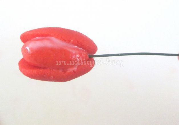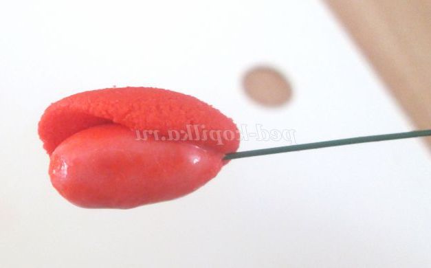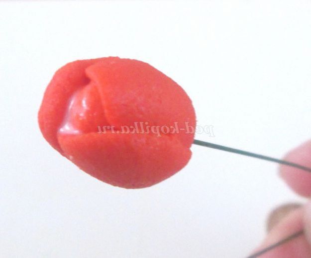 Беремо шматочок червоного тесту, в діаметрі не більше сантиметра. І катаємо спочатку в краплю, а потім надіти крапельку на дріт (це будуть внутрішні листя квітки).