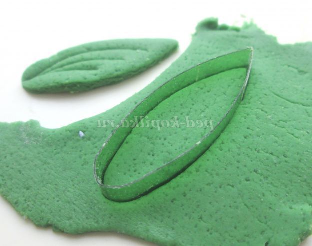4. Зелене тісто розкочуємо тонко (2 мм) і великий формочкою-листком вирізаємо 2 листочка.