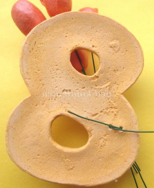 Відрізати шматочок дроту довжиною 6 см, потім зігнути дріт петелькою і вставити в отвір вісімки. Прикріпіть букет на вісімку.