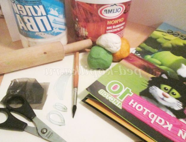 1 частина борошна,1 частина солі (сіль обов'язково дрібна), клей ПВА - 1-1,5 столові ложки, вода, гуаш (біла, жовта, зелена). Гуаш розводимо у воді, тільки потім додаємо борошно. Кожний колір замішуємо окремо. Замішуємо круте тісто