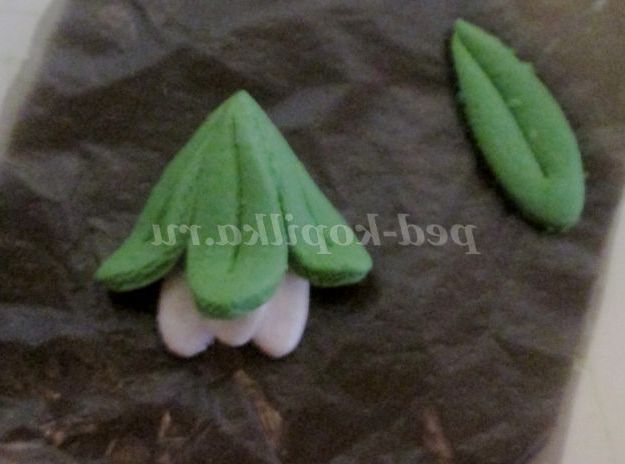 2. Зелене тісто розкочуємо тонко (2 мм) і формочкою-листком вирізаємо 2 великих листочків і 8 маленьких. Лопаткою робимо прожилки у листочків. Листочки сушиться до готовності.