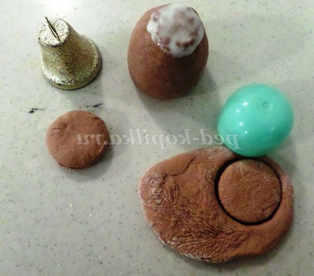Матеріали: 6 кольорів солоного тіста - зелений, рожевий, коричневий, темно-коричневий, червоний, чорний; клей ПВА; кисть; 3 зубочистки (покриті зеленою фарбою); кругла форма (можна зробити з пляшки з круглим шийкою (наприклад, з-під шампуню), якщо обрізати рівно горлечко або частина яйця від кіндер-сюрпризу; дзвіночок); формочка-листок велика і маленька; лопаточка(можна користуватися і стеком); скалка; дошка для розкачування тіста; шматочок тонкого дроту; 3 шматочки плівки, 3см на 3 см (можна відрізати від поліетиленового мішка), паличка з круглим кінцем.
