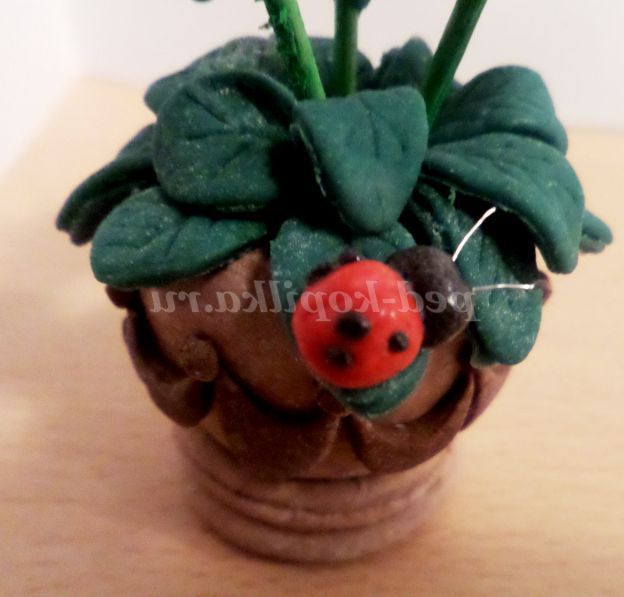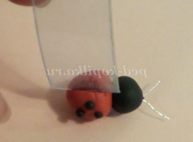 6. Робимо божу корівку. З шматочків тіста червоного і чорного кольору сформувати дві кульки, причому червоний трохи більше чорного. Місце кріплення змастити клеєм і з'єднати. Шматочок тонкого дроту складаємо навпіл і робимо вусики.